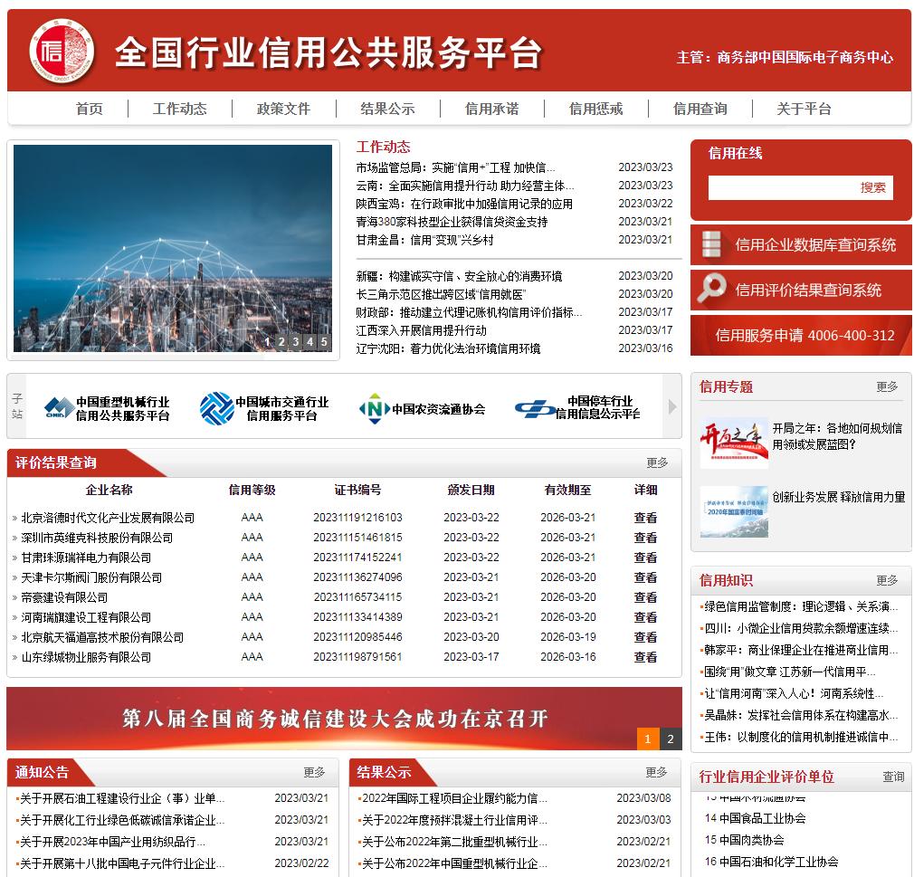 全國行業(yè)信用公共服務(wù)平臺是在國家發(fā)改委、商務(wù)部、民政部、國資委的指導(dǎo)下,由商務(wù)部中國國際電子商務(wù)中心主辦的專業(yè)信用體系平臺。匯聚了行業(yè)質(zhì)量過硬企業(yè)的信用評價、信用檔案等系列權(quán)威認(rèn)證數(shù)據(jù)。