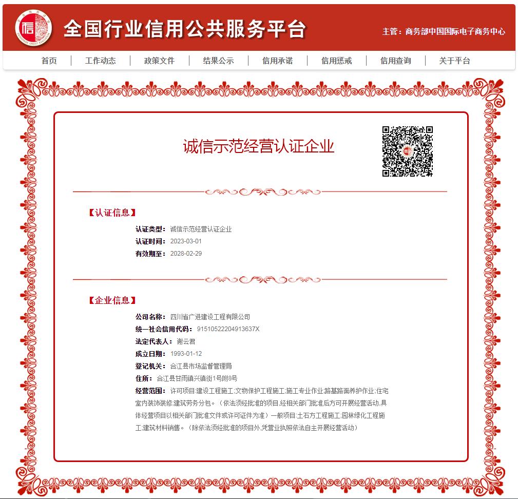 四川省廣進(jìn)建設(shè)工程有限公司應(yīng)邀參加此次評選活動,成為2023年首批榮獲“誠信示范經(jīng)營認(rèn)證企業(yè)”榮譽(yù)稱號。